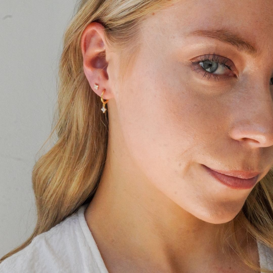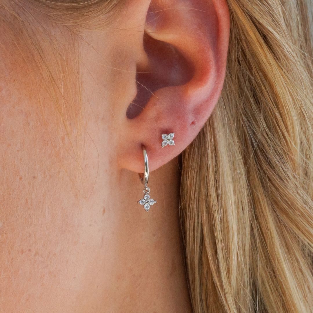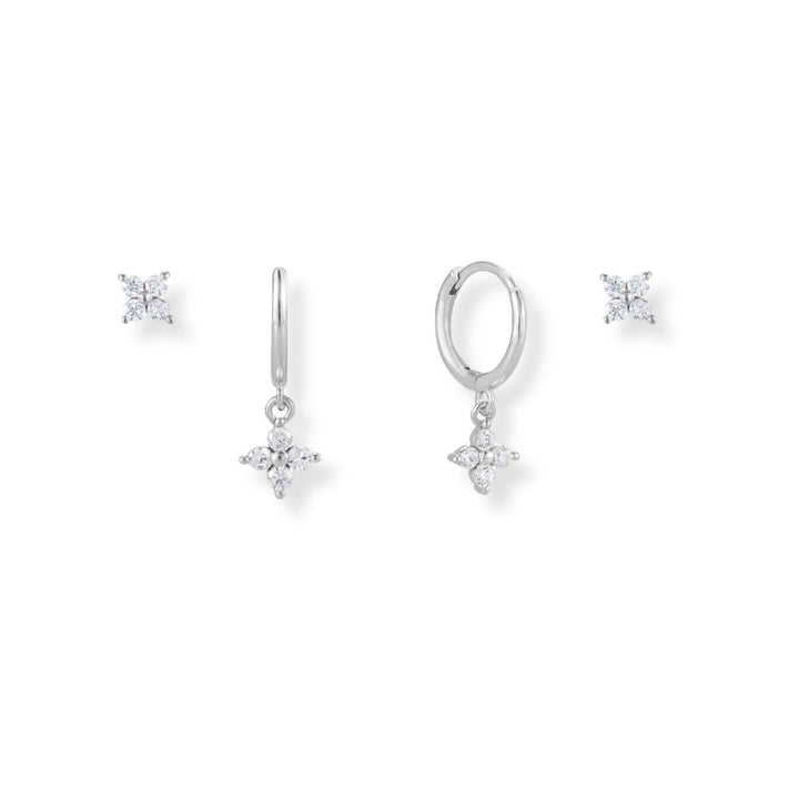 Embrace spring with this delicate silver earring stack featuring flora drop huggies and matching studs. A graceful pairing inspired by nature's blooms.