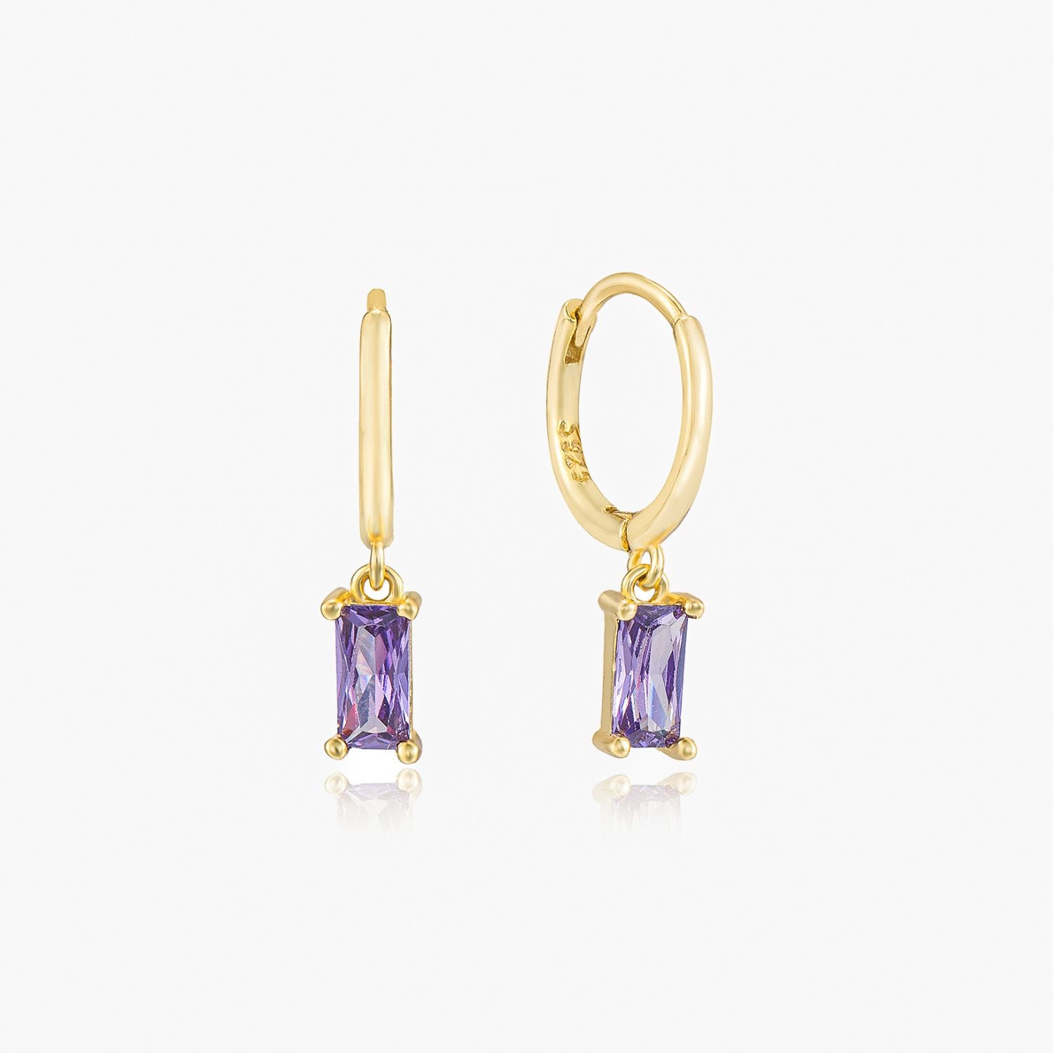 These exquisite earrings showcase stunning purple baguette-cut gemstones gracefully suspended from sleek gold huggie hoops. They bring a striking touch of sophistication and colour to any ensemble.