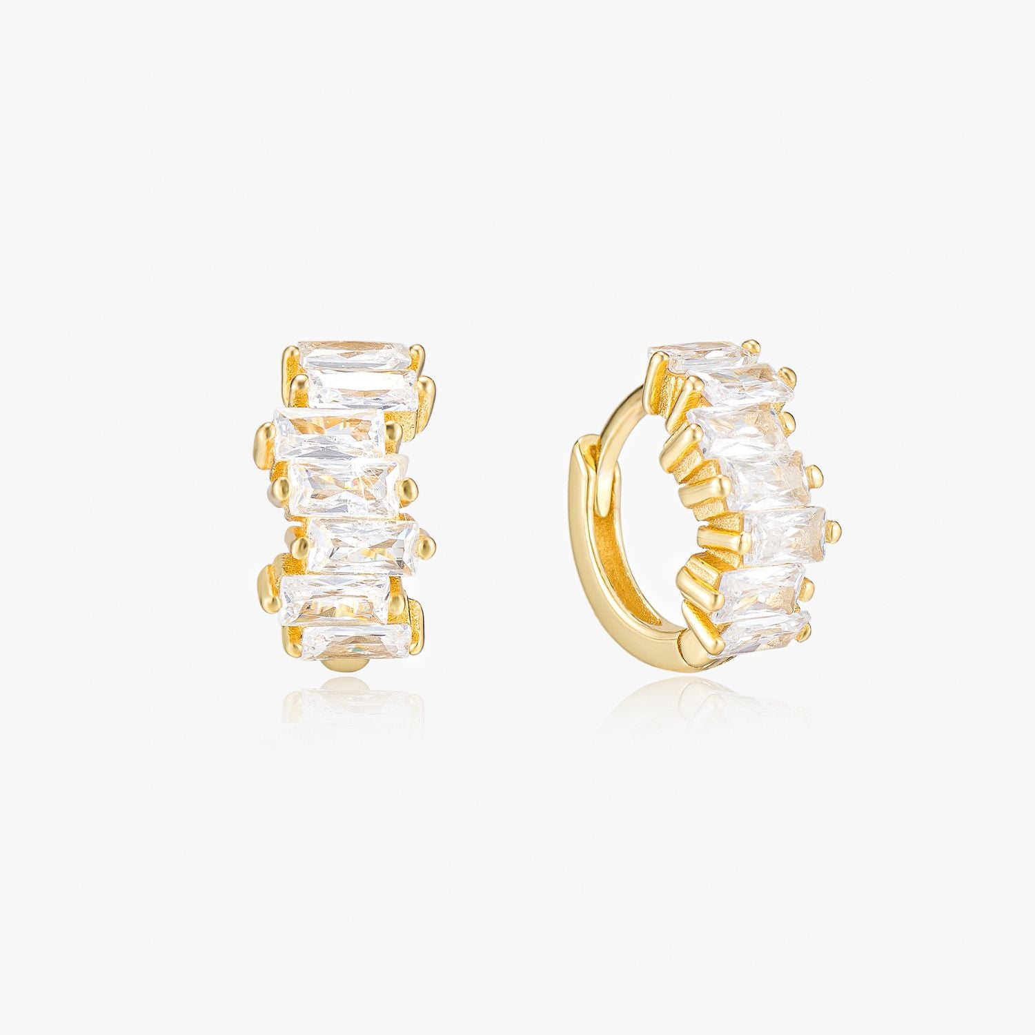 Our Leyla Sparkly Huggies are the ultimate blend of elegance and brilliance. Dainty yet eye-catching, they feature a row of dazzling baguette-cut cubic zirconia that catches the light from every angle. Crafted from 925 sterling silver and finished in radiant gold, these huggies are lightweight and perfect for everyday wear—whether you’re dressing up for a special occasion or adding a touch of sparkle to your daily look.