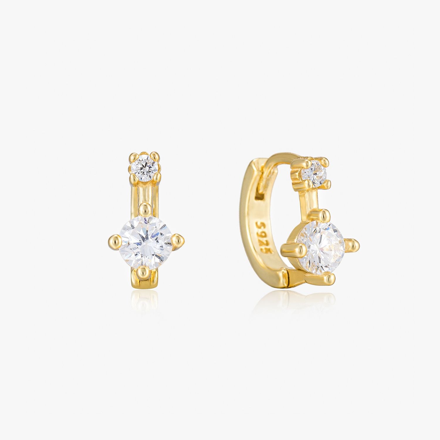Introducing Raisa, elegant and sparkly CZ huggie hoops designed for everyday luxury. These dainty earrings feature two CZ stones that catch the light with every turn, adding a subtle yet striking touch to any outfit.