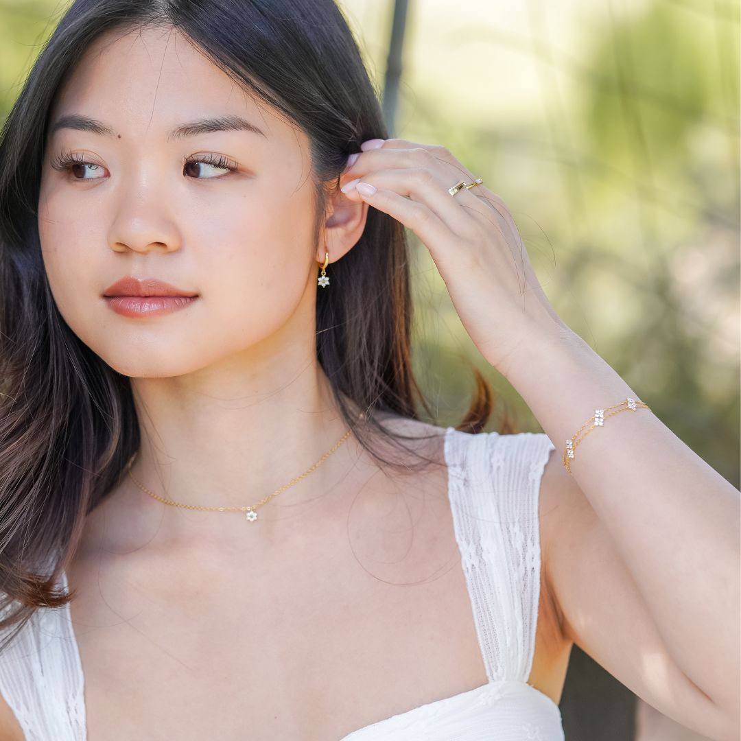 Bring a delicate shimmer to your wrist with the Rosie Flora Bracelet. Featuring dainty floral-inspired cubic zirconia charms along a fine 18K gold-plated chain, this bracelet adds a touch of delicate femininity to any look. Perfect for stacking or wearing solo, it's an effortlessly elegant piece you'll reach for every day.