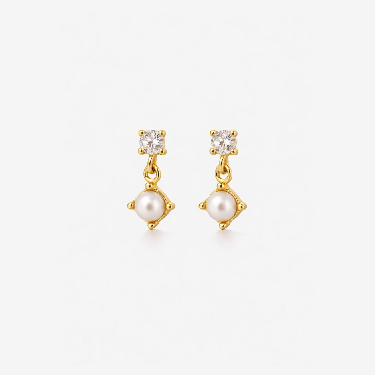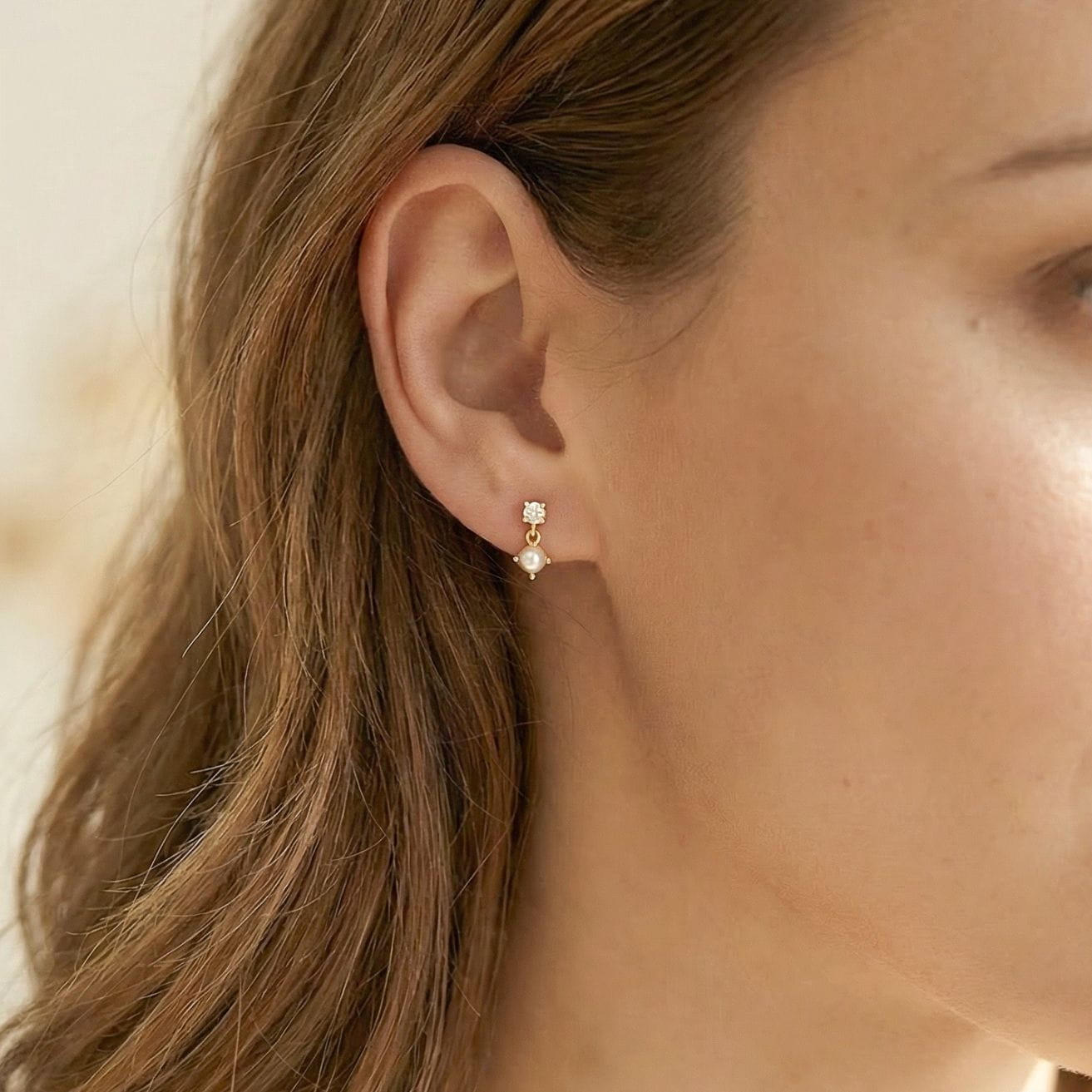 Refined elegance meets everyday ease. The Ivy Pearl Drops pair round CZ studs with dainty freshwater pearls suspended delicately below. Feminine, graceful, and endlessly versatile — wear them solo or layered with other studs for a romantic stack.