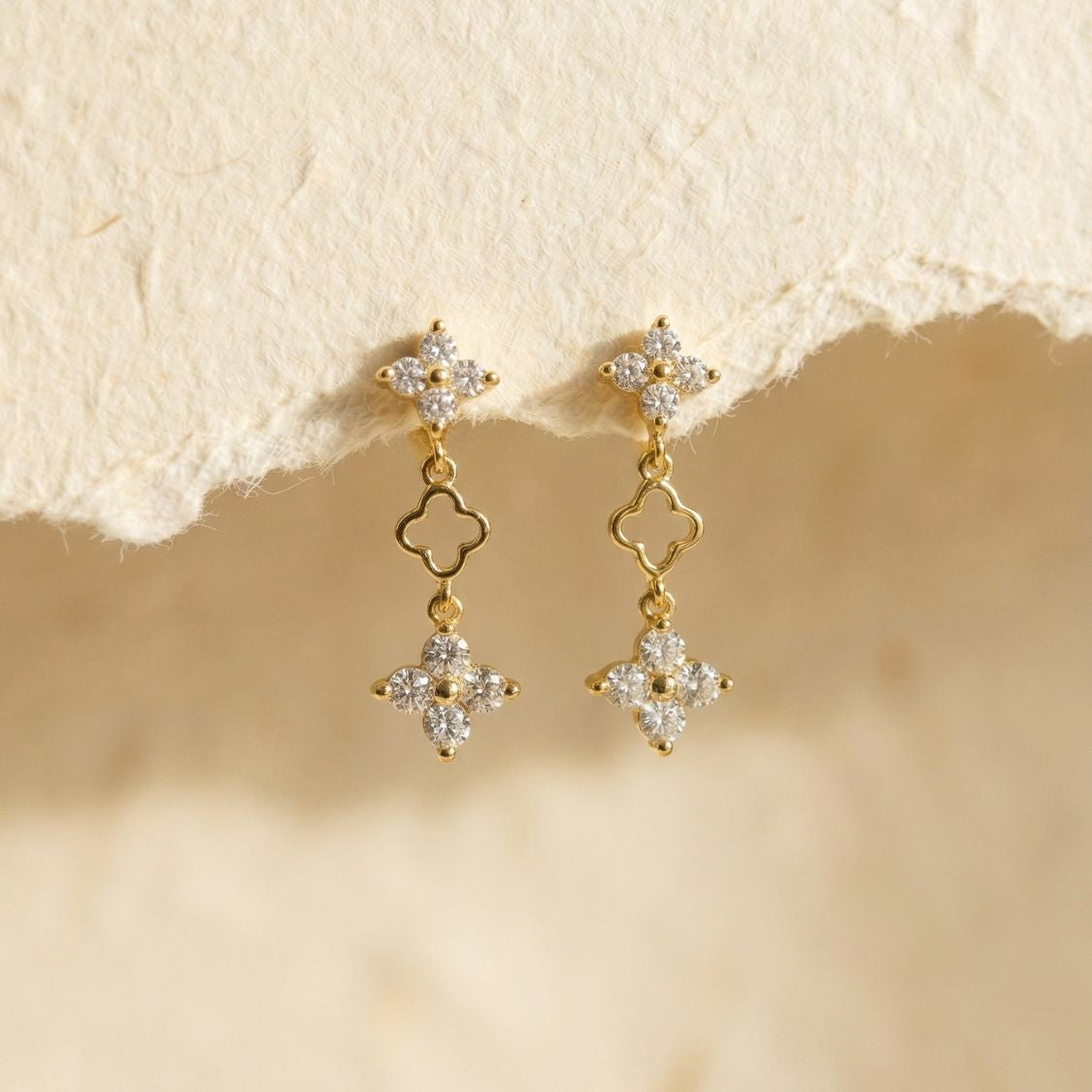 Featuring floral-inspired CZ clusters connected by a delicate quatrefoil link, these drop studs strike a perfect balance between dainty and eye-catching.