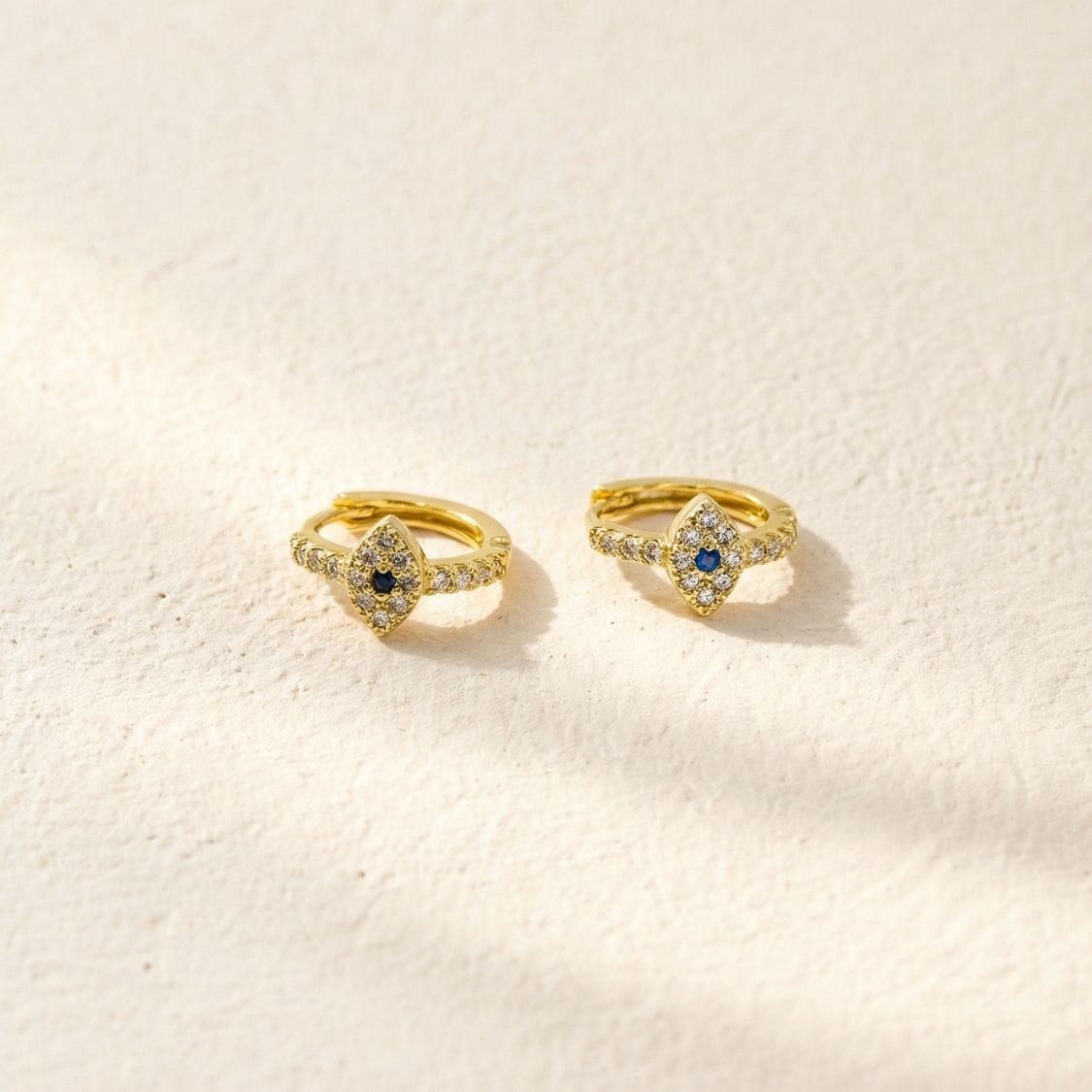 The perfect blend of elegance and charm, use this pair of sparkling Evil Eye Huggies to make a statement in your style.