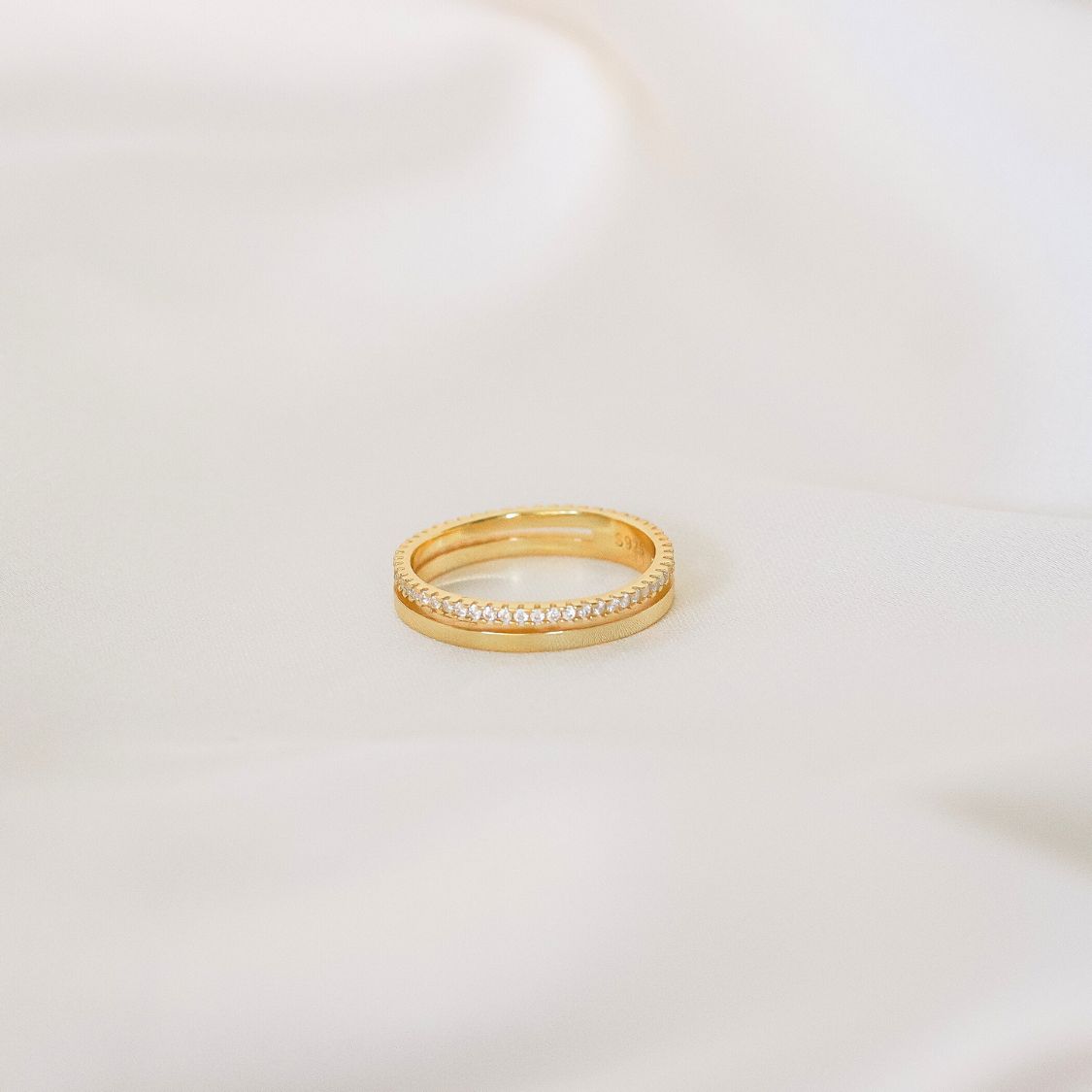Two bands, twice the charm. The Sienna Ring features a sleek double band with a row of dainty pavé CZs, offering the look of a stacked set in one effortless piece. Elegant yet bold – perfect for both everyday and elevated looks.